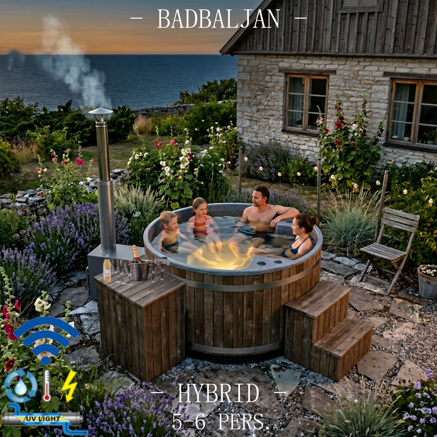 Våran hybridbadtunna med både ved- och eluppvärmning ger alla möjligheter och alternativ. Värm upp vattnet snabbt och kostnadseffektivt med vedkaminen och håll badtunnan badvarm sen så länge du vill. Eller låt reningssystemet hålla vattnet rent och grundvarmt och toppa upp värmen med vedkaminen snabbt och smidigt inför bad. Den effektiva extra UV-ljus reningen minimerar alger och sporer i vattnet –det som annars ger en halkig hinna. Hela badtunna och reningssystemet med elvärmaren levereras komplett för smidig självinstallation med hjälp av detaljerat steg för steg vägledning.