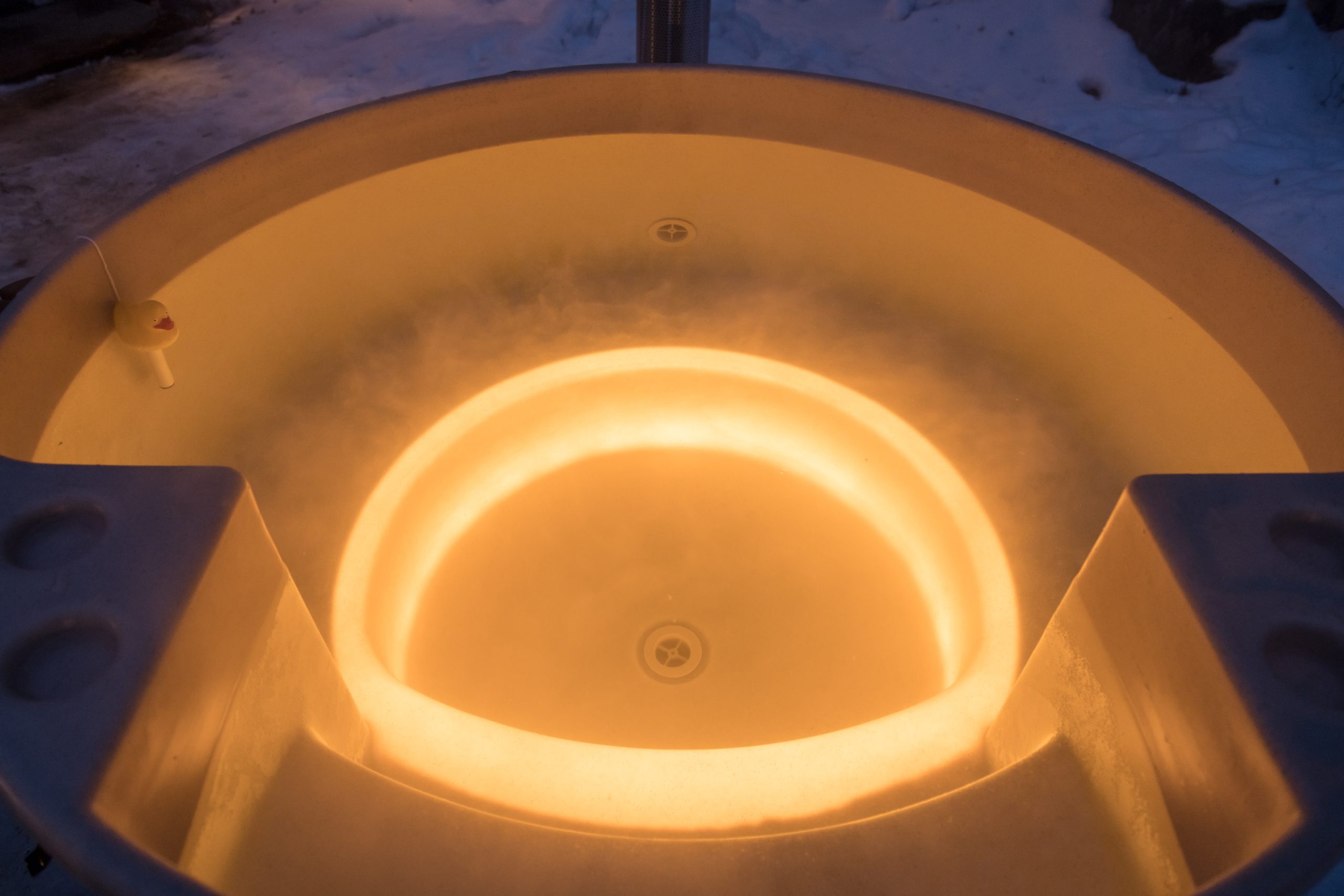 • Eller så låter man elvärmaren frostsäkra badvattnet och värmer upp badvattnet med vedkaminen. T.ex. om det är ca 10 minusgrader ute och man har badat ena helgen så tar det normal flera dagar innan vattnet kallnat tack vare att badtunnan är så välisolerad och att man har vårt spalock på. Reningssystemet renar badvattnet och har man termostaten på elvärmaren på ca 10-15 grader så kommer den först aktiveras framåt mitten/slutet av veckan. Det är en stor tidsskillnad att värma upp 15 gradigt vatten till härliga 38-40 grader det tar normalt bara runt en timme.
