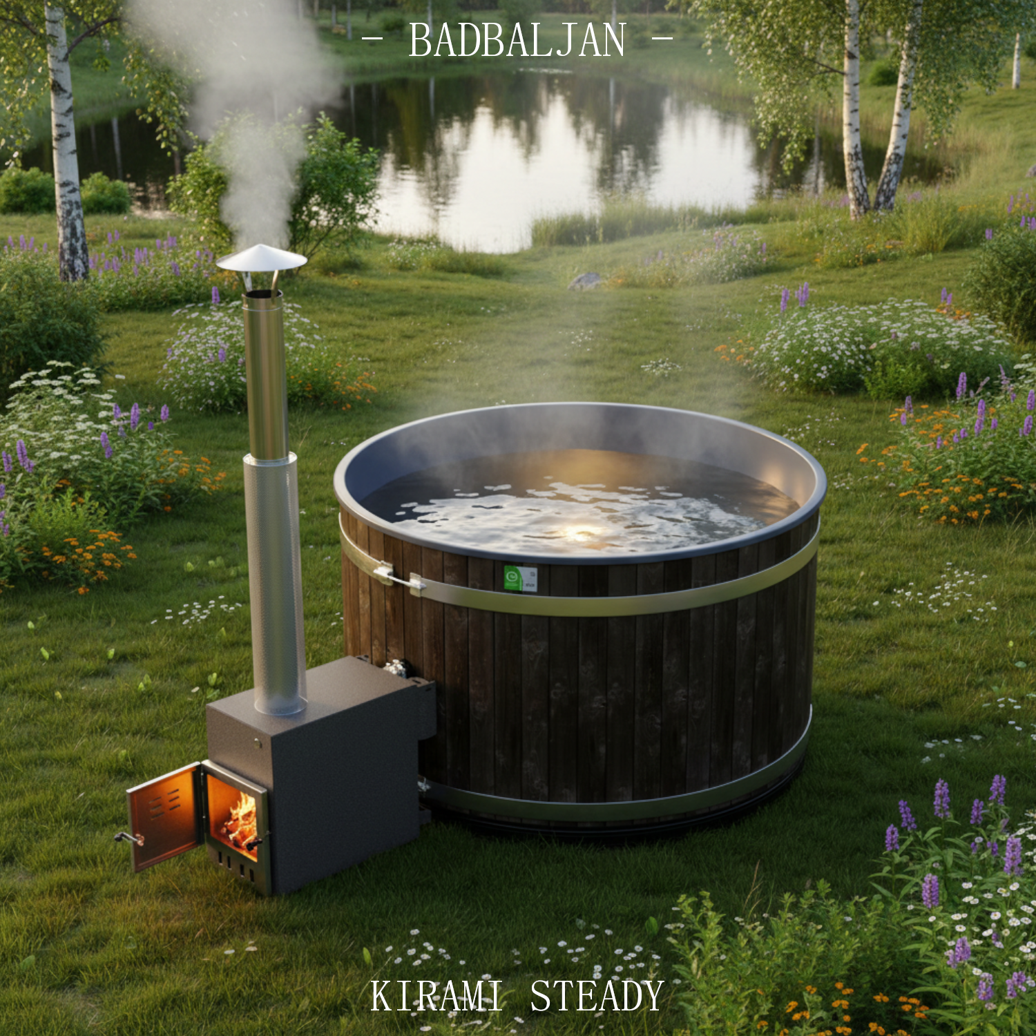 Badtunna Kirami Steady är isolerad monterad vid leverans och den externa vedkaminen sätts enkelt och snabbt på plats. Denna badtunna har hela 47 cm tjock isolering under sitsarna runt om och 20 cm tjock isolering under golvet som stoppar markylan. Undersidan på denna badtunna är en helt slät och placeras enkelt på en plan, slät och stabil yta, t.ex. en bädd av grus/kross. Utsidan har en monterad ädelbetsad ytterpanel av furu i en stilren svart ton (eller mörkbrun) där träets fina ådring framgår diskret. Ytterpanels ändträ är nästan helt skyddad nedtill av den gummisockel som löper runt badtunnan vid marken. Denna ytterpanel är nära på underhållsfri. En snabb enkel strykning var femte år med denna ädelbets håller badtunnan normalt som ny. Denna nya plastinsats i denna badtunna är av något tjockare, polarblå melerad och slätare homogen genomfärgad polyetenplast – Alltså ingen risk för färgsläpp, blåsor eller att att plasten skiktar sig! Ytan är smutsavvisande och hygienisk samt snabb och enkel att rengöra, tål att högtrycktvättas! Plasten är UV skyddad, tål alla klimat, värme upp till +130˚C och kyla ner till -50 °C. Plasten är åldersbeständig – med mer än 40 år beräknad livslängd och torkar inte sönder. Miljövänlig – Helt återvinningsbar plast.