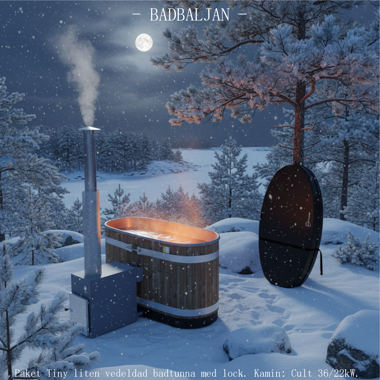 Som uppvärmare används en utvändig, Cult vedkamin som passar små och medelstora badtunnor. Kaminen är tillverkad i högklassig, värmeledande marinaluminium. Som ytterpanel är den värmebehandlade tallen ett inhemskt alternativ till mörka importerade träslag. Det värmebehandlade träet i den varma bruna färgen är i hög kvalitet och håller sin form. Plastinsatsens sammetslena, ljusgråa färg är nyanserad med flake-effekt passar i alla miljöer och är extra förlåtande med brunns eller sjövatten.