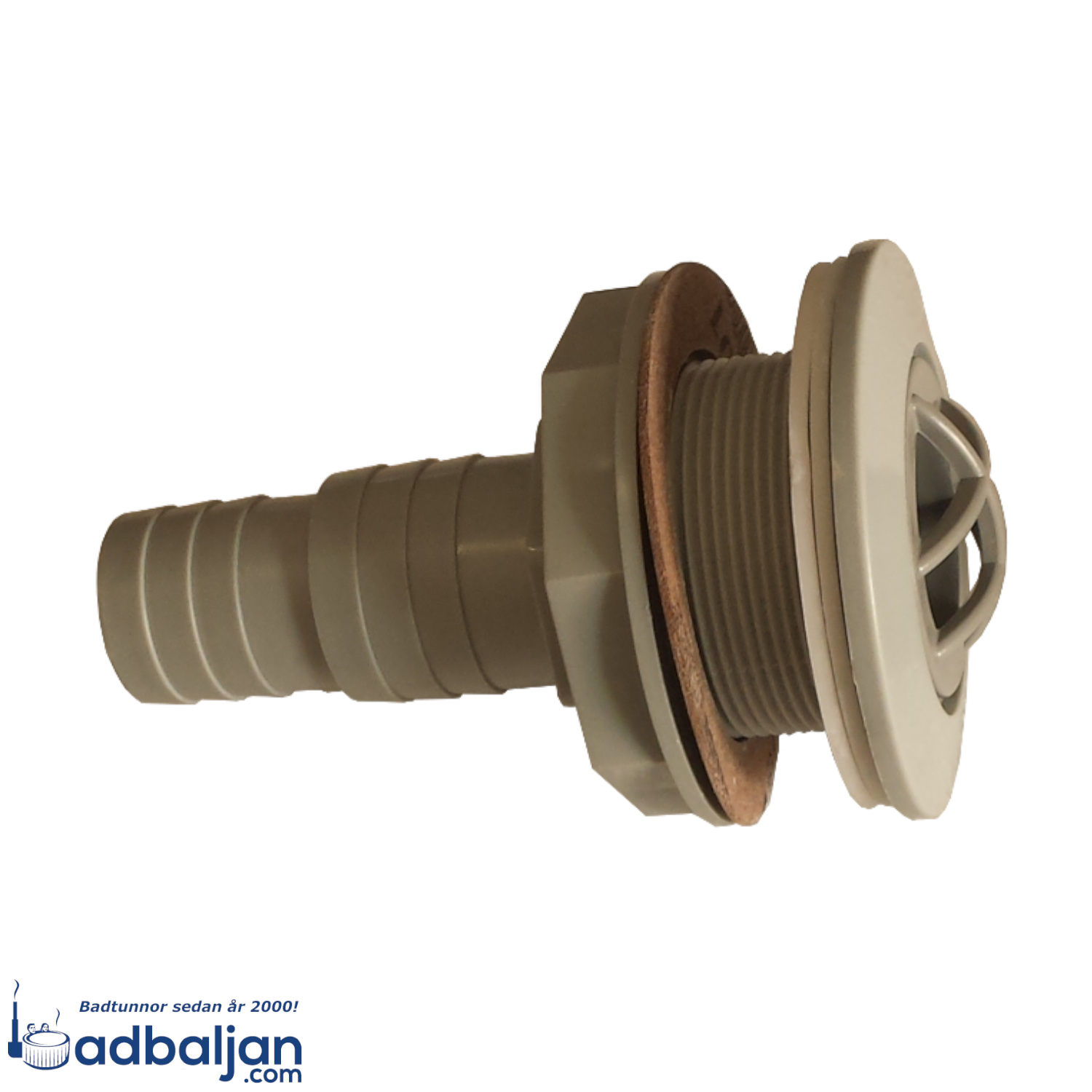 Utlopps genomföring med gallerinsats, vinterpropp, slangnippel & slangklämma. För att koppla utgående slang till reningsverk från badtunna eller pool.